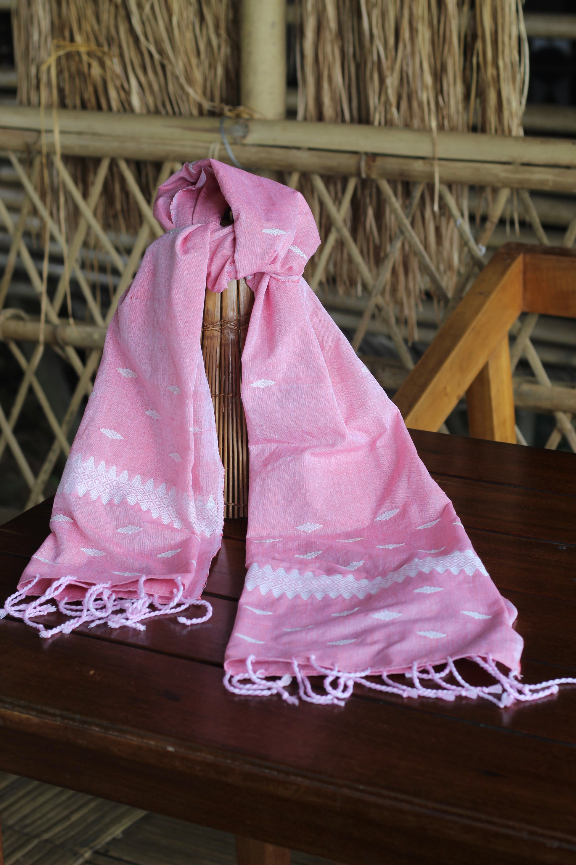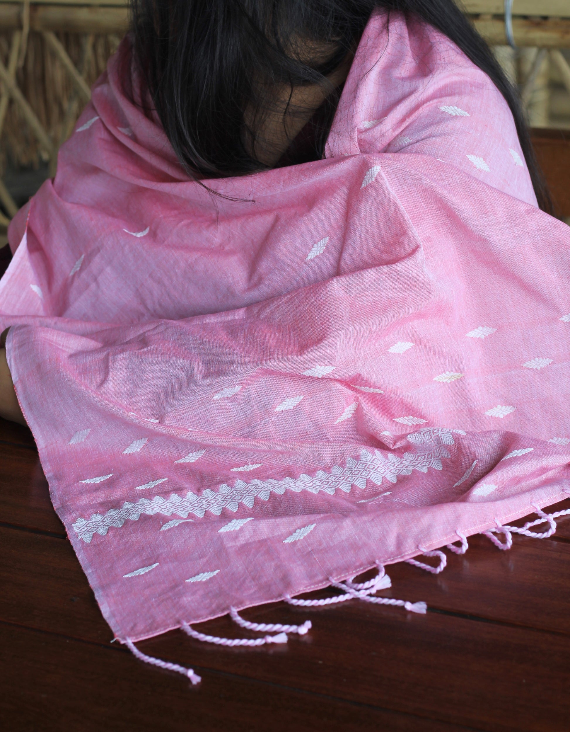 Radiating gentle charm, this pink cotton stole is all about quiet elegance. With delicate white motifs scattered like whispers across its surface and a beautifully woven geometric border, it brings a breath of calm sophistication to any ensemble. The soft tassels add a playful finish to this graceful wrap.